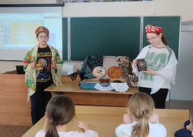 Проект «Музей в чемодане». Активистами школьного музея «Вечные родники» под руководством учителя истории Протасовой Р.М. было подготовлено и проведено очередное музейное занятие «Народные промыслы России» для обучающихся 1-4 класса.