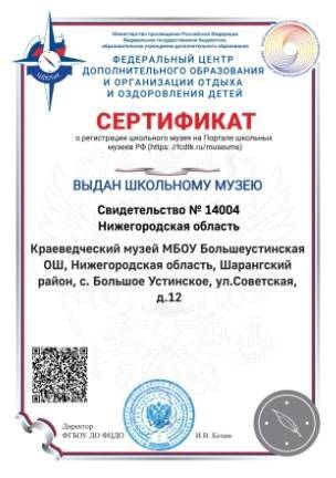В 2022 году школьный музей занесен в Реестр Федерального центра дополнительного образования детей. Более подробная информация о музее далее ...